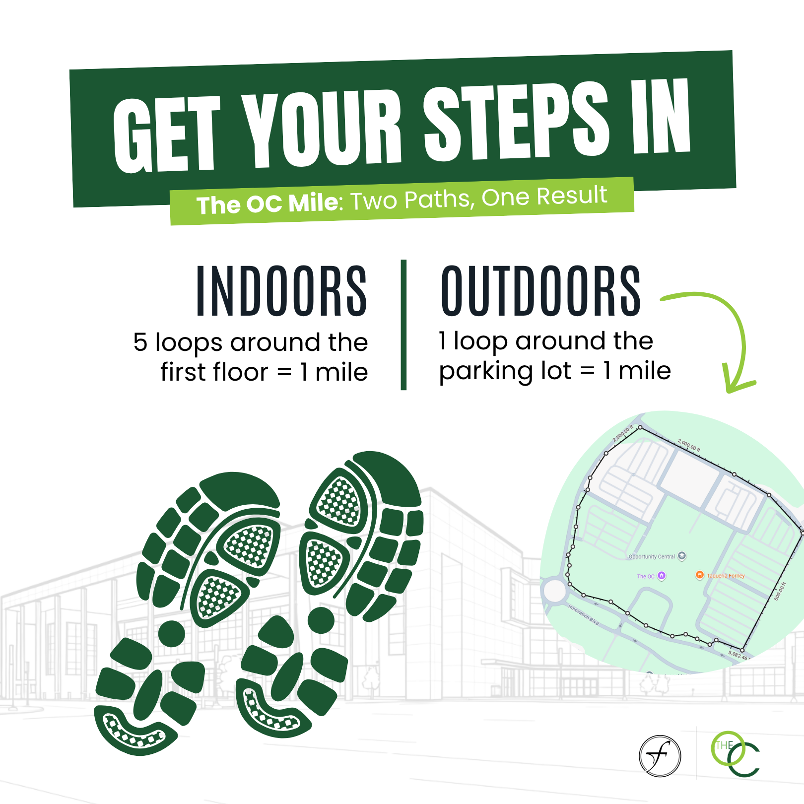 Whether you’re looking to beat the heat or enjoy a fresh breeze, The OC is the place to reach your fitness goals. We’ve mapped out two paths to help you track your progress: stay cool on our indoor first-floor loop (5 laps = 1 mile) or enjoy the sunshine on our outdoor sidewalk path (1 loop = 1 mile). No matter your pace, our facility provides a safe, comfortable and community-focused space to stay active and healthy year-round!